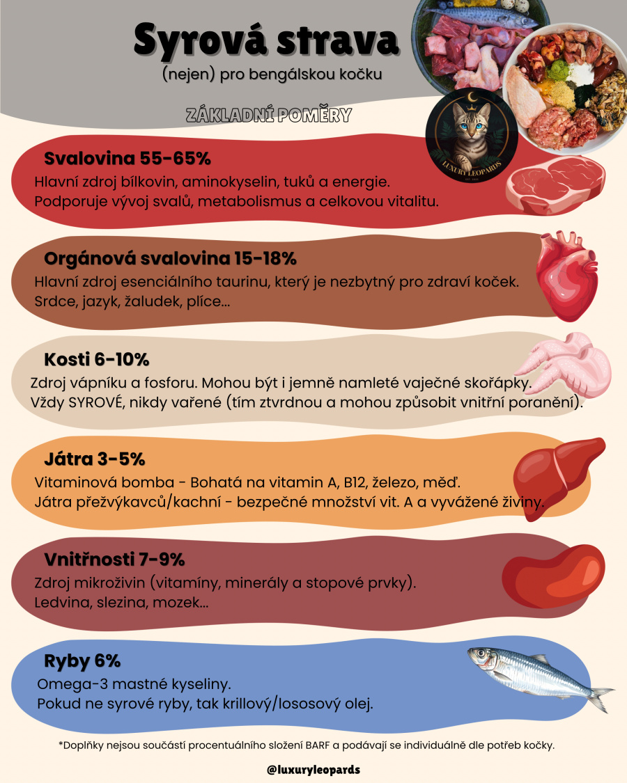 Syrová strava musí být vyvážená. Samotné maso nestačí. Je nutné dodržet poměr svaloviny, kostí, orgánů a doplňků, aby kočka přijímala všechny potřebné živiny.